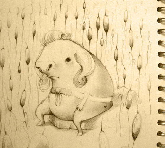 Meet the twins. A morbid pair, stuck in a pink piggish kingdom, some may call it swine paradise. This drawing went through many changes during the color transition. Hairstyle, theme, composition and story. This happened for a few reasons. My sister didn’t like her hair-do in the sketch version: “She looks like a judge” so than came the first change and suddenly she looked too lonely so I added her twin sister and than it started looking very “shine twins” and so the hotel corridor was a pretty natural choice for the environment. The Swine twins were born or as I call them The Shwine twins