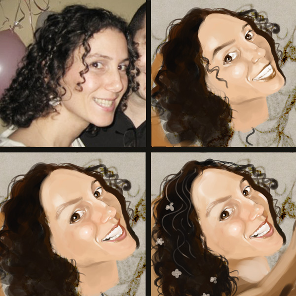 On the top left is the photo reference and after that the not so great, slightly creepy first attempt, which underwent changes and finally was made to resemble Inbal.