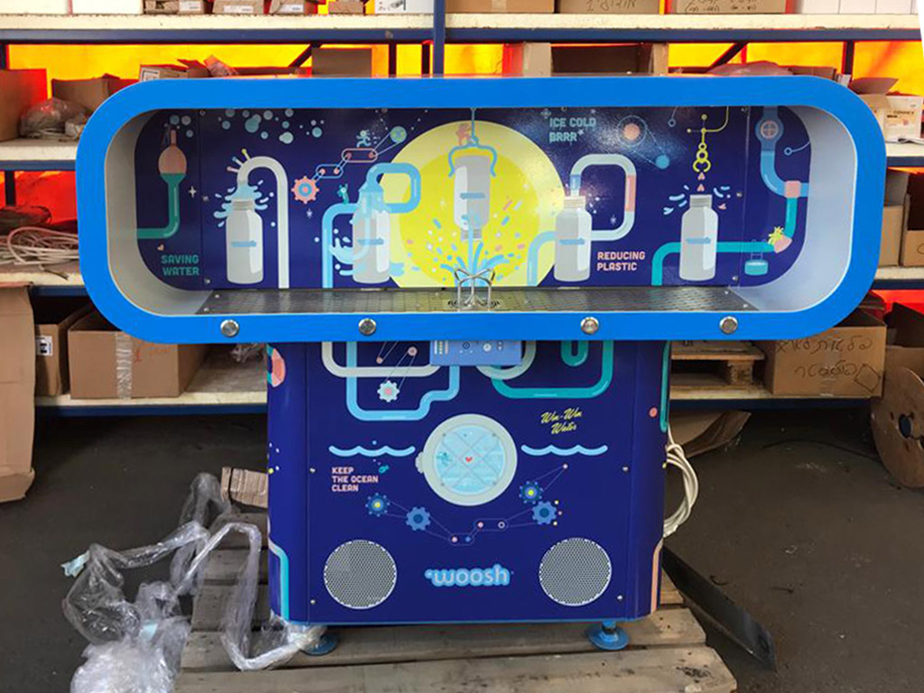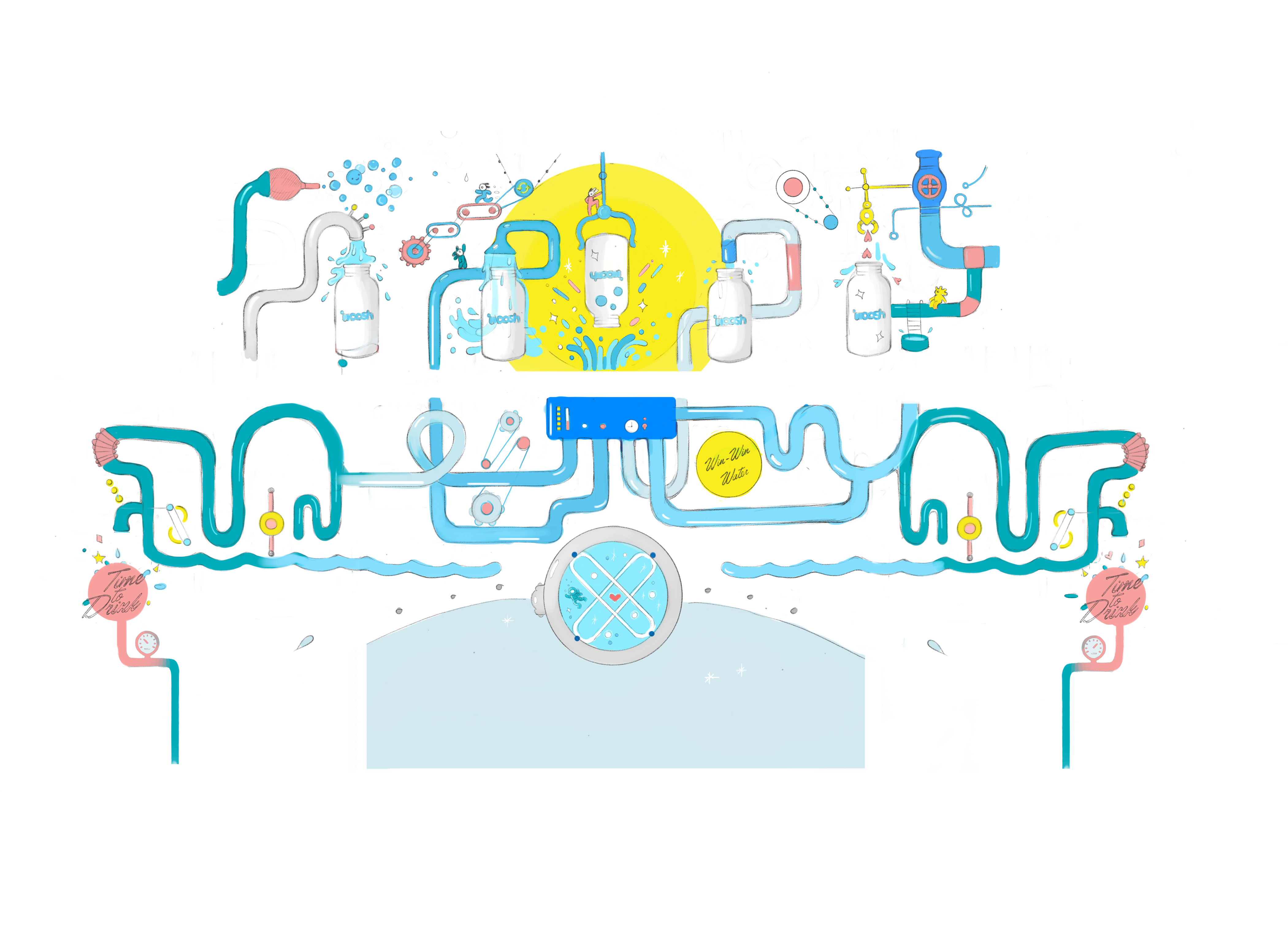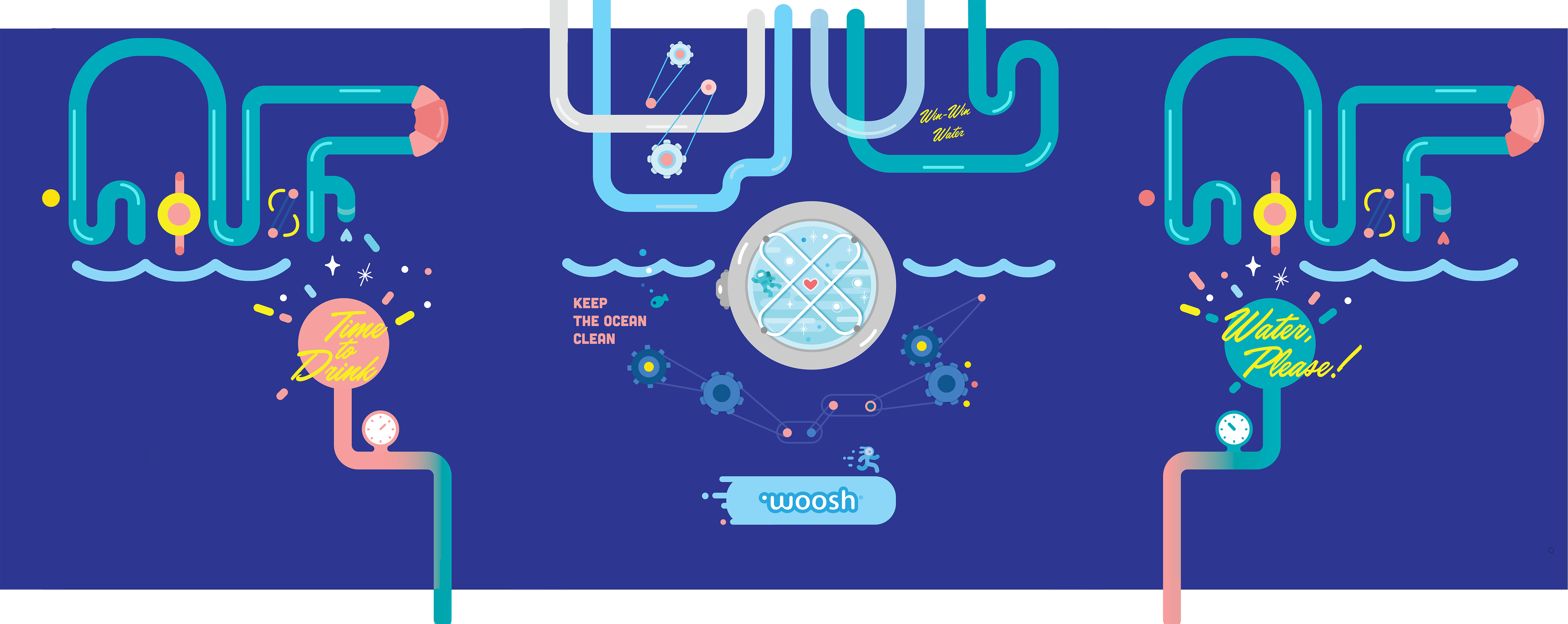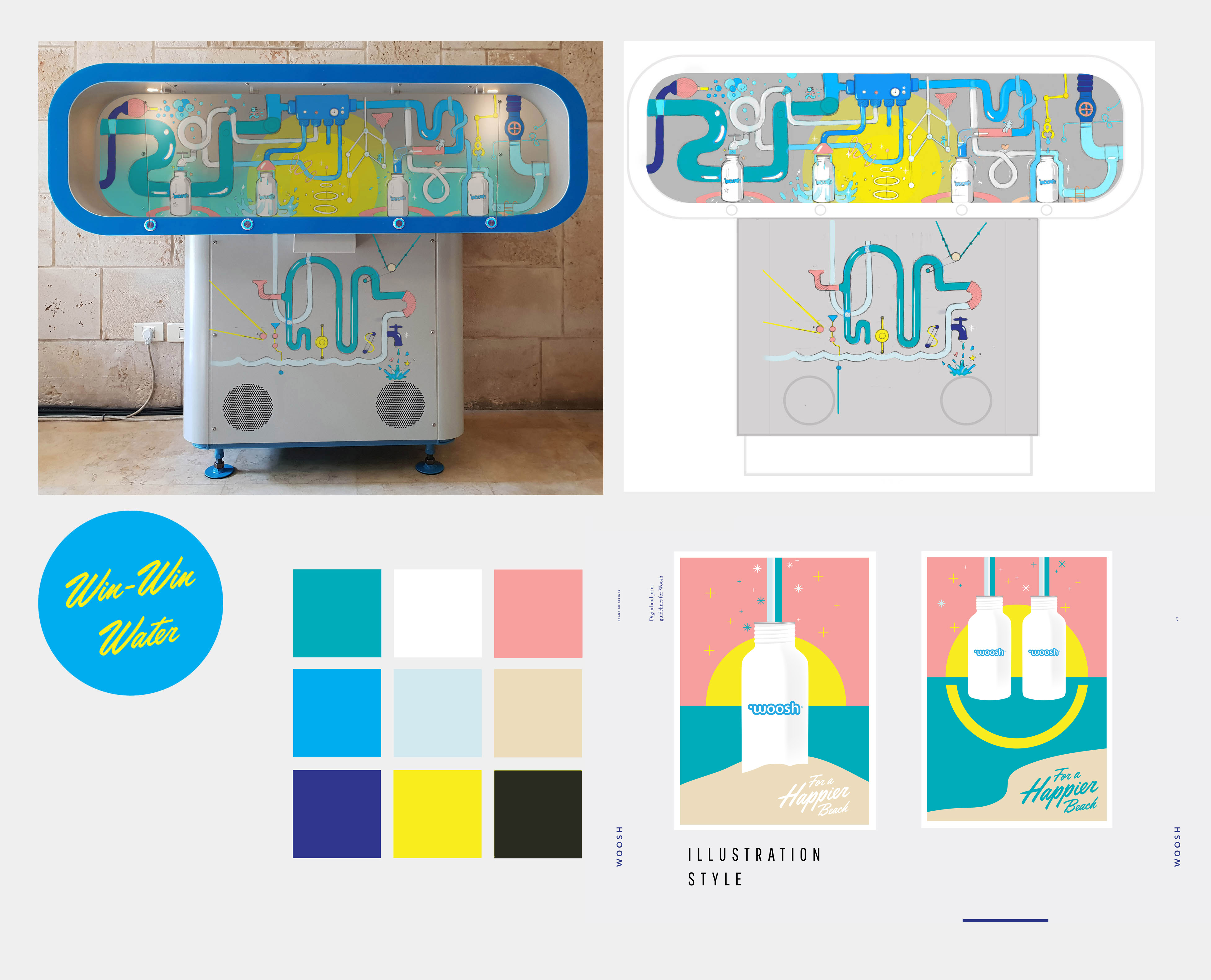 I was to create a unique illustrated sticker for woosh – A company that creates innovative & smart water stations. The sticker was intended to coat a real live physical station. The station was aimed to suit the needs of schools in a few states. The benefits the company promised – was clean water. A sterilization mechanism to clean personal bottles and provide new ones in high standers for those who wanted to buy it. The design needed to be fresh, cool, and watery. I had no idea states such as Florida (which is tropic and rainy as heck- I lived there so I know this by first hand) needed a clean water device. But I guess pollution gets everywhere and touches on everything. This product met a need and I was happy to be apart of something which combined education, health, and wellness. The holy trinity.The process