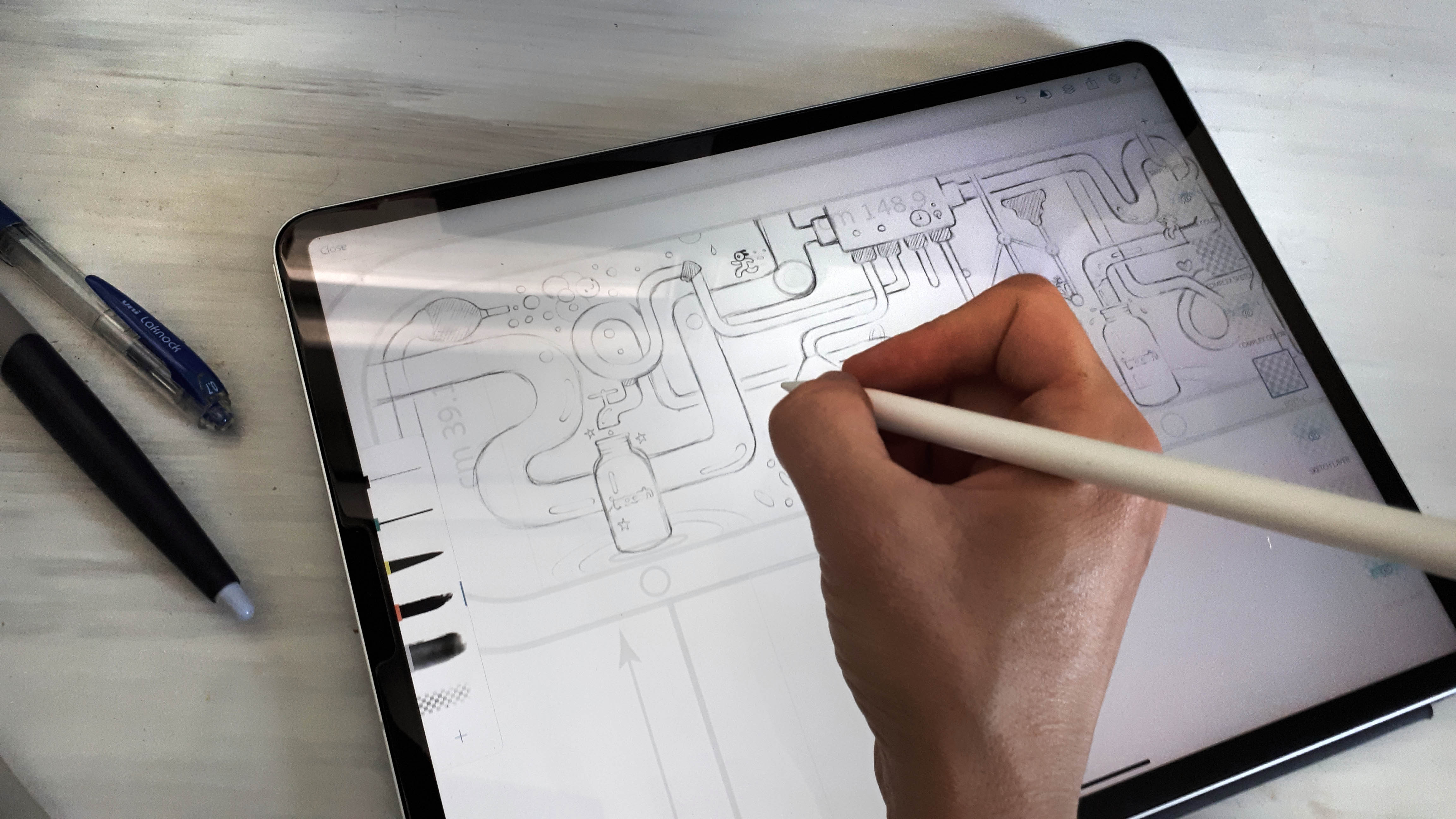 This is my favorite part honestly. Because sometimes the clients get overwhelmed. Or tied up to a particular idea they simply can’t shake off. it’s hard to pass the first stage of sketching with a clear cut decision. so this took a while. But at last, we decided on the option of an inner network of pipes and mechanisms. The technical people actually said what I illustrated resembled the inner mechanics. I wondered about that. Especially about the little helpers running inside. I guess maybe my own imagination of life’s rat race came out here. There’s only one little yellow dude in the bottom who looks like he’s taking a break.Final sketch