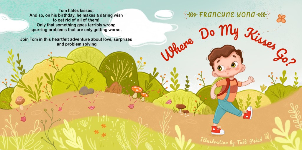A cover design for a children’s book by Francybe Yona, about a boy and some pesky kisses. For a tailored price, contact me here.