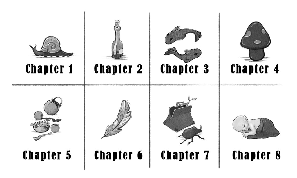 A collection of Vinniet chapter headings for a fantasy book by Eshkar Erblich-Brifman.
